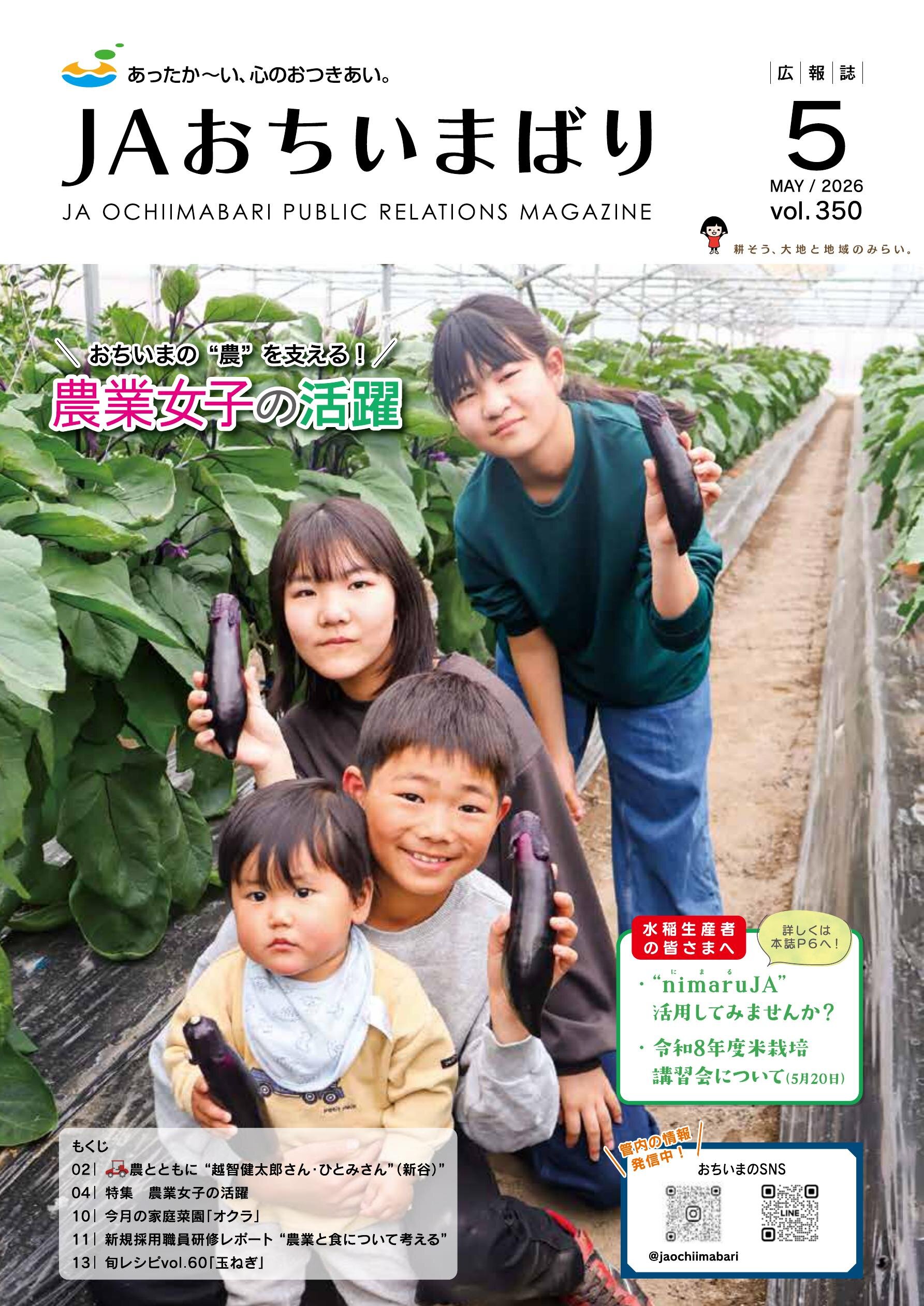 JAおちいまばりでは組合員、地域の皆さまに、JAのことを知って、好きになってもらおうと広報誌「JAおちいまばり」を毎月発行しています。「あったか~い、心のおつきあい。」を皆さんとしたいので、ご意見、ご感想はもちろん、おたよりも募集しております。ぜひ送ってくださいね!