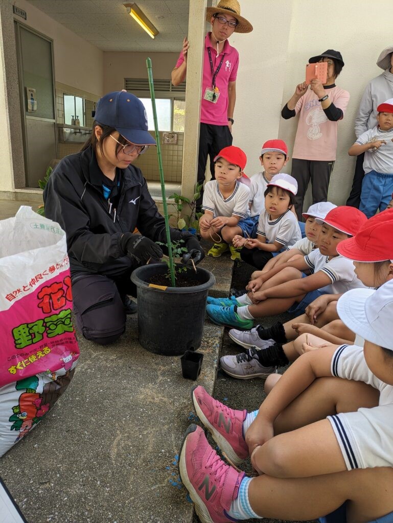 令和6年5月13日、ミニトマトの定植とサツマイモつるの贈呈を行いました。営農指導員の説明を聞きながらプランターにミニトマトを植えていました。ミニトマトの茎と支え棒にちょうちょ結びが上手にできた児童さんが他の子にも教えてあげるなどしていました。サツマイモつるは時間の都合で、後日先生に植えてもらいました。先生からも授業後に何度か質問があり、児童さんと話をしながら育ててくれているので、たくさん収穫できると期待しています。