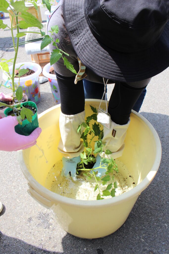 植え付ける穴に水を注いでおき、さらに苗も水にひたしてから苗を植え付けます。