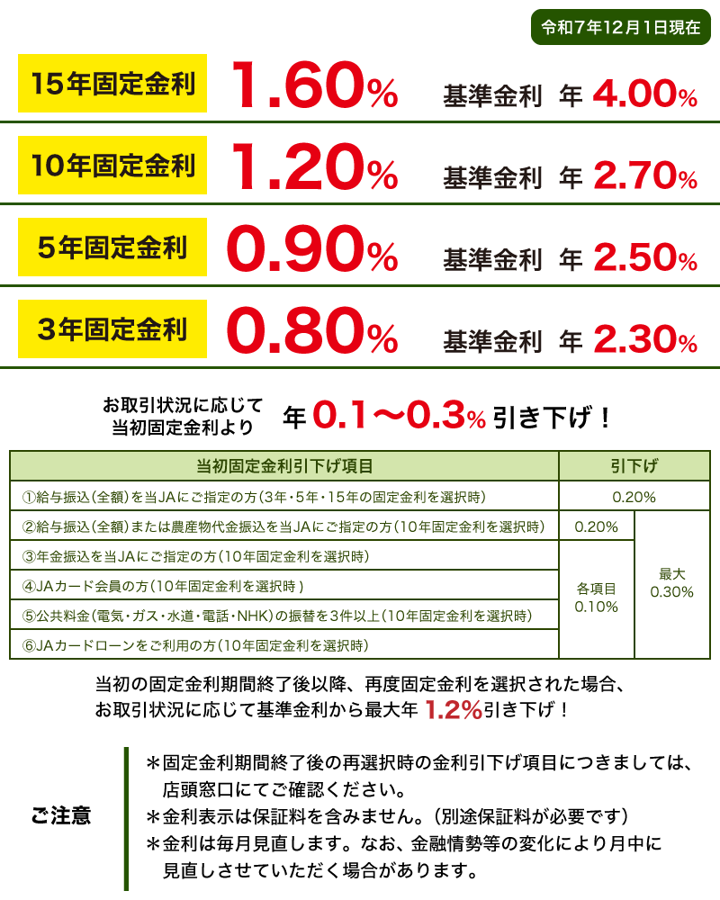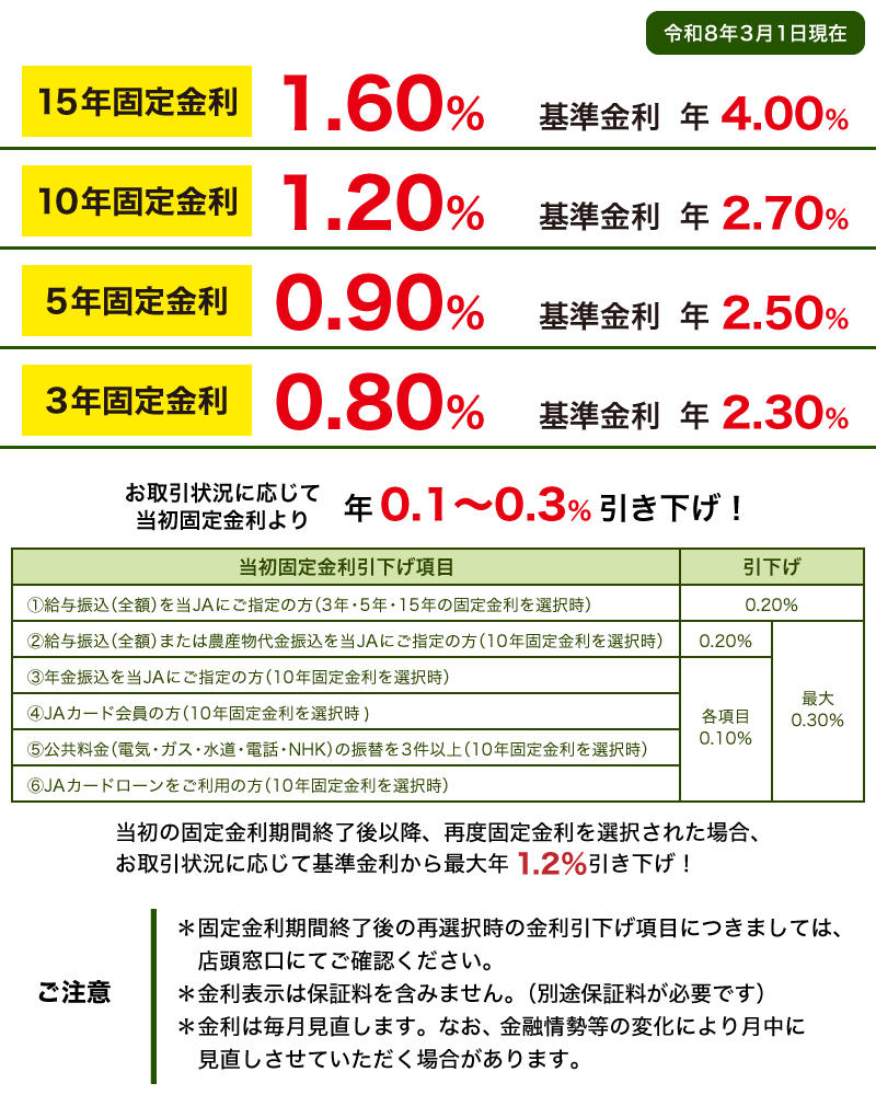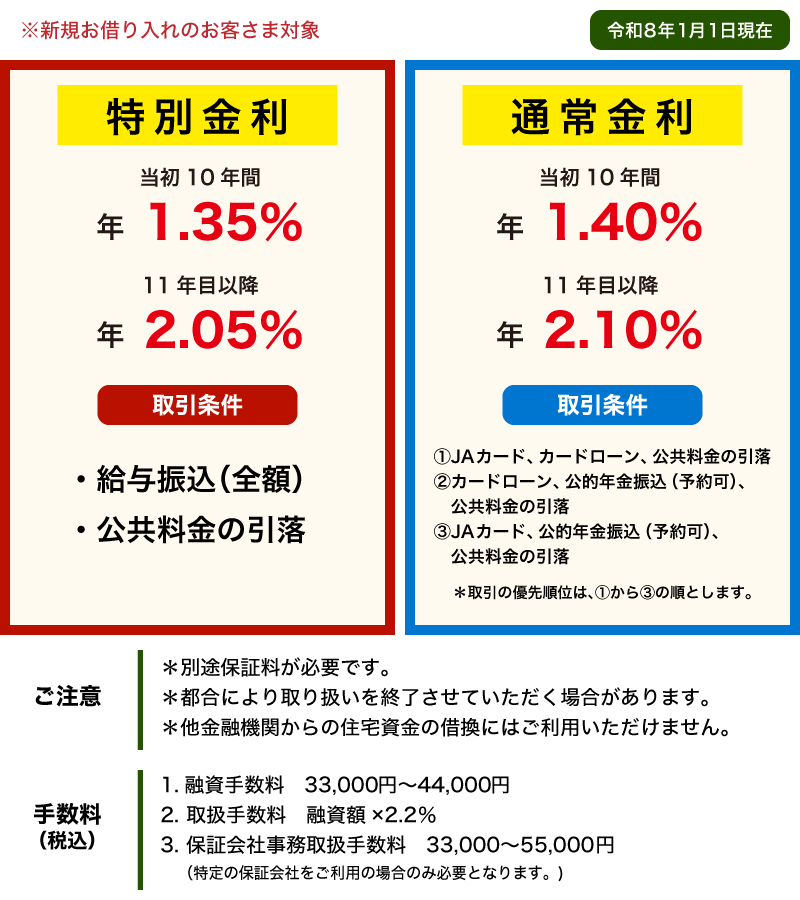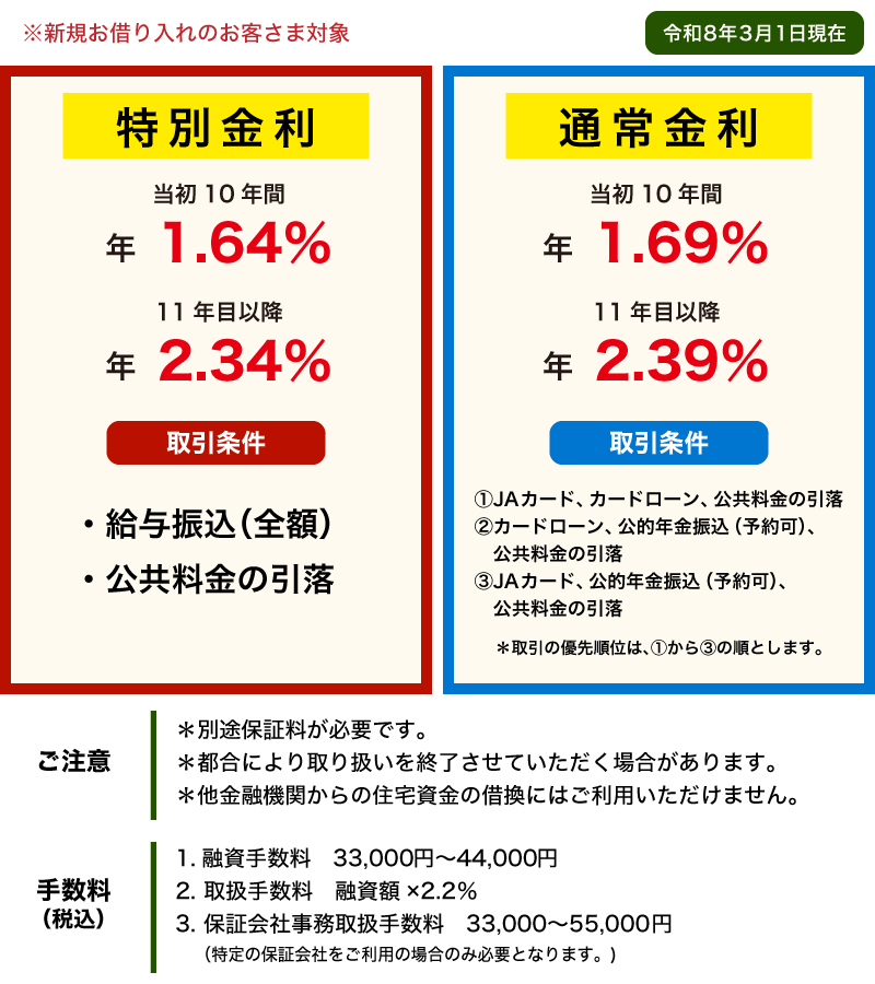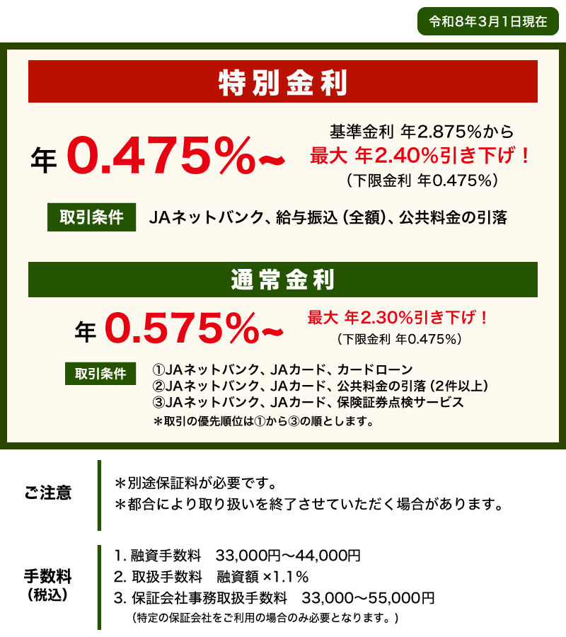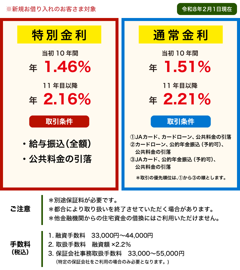 お金のこと お金を借りたい! 住宅ローン 住宅ローン 住宅の新築・中古住宅の購入・他金融機関でお借入中の住宅資金の借換等にご利用いただけます。 長期固定段階金利型 新変動金利型 固定金利期間選択型 長期固定段階金利型 インターネット仮審査申し込み チラシデータ 新変動金利型 インターネット仮審査申し込み チラシデータ 固定金利期間選択型 インターネット仮審査申し込み チラシデータ 詳しくは商品概要説明書をご覧ください。 JA住宅ローン(一般型)商品概要説明書 JA住宅ローン(100%応援型)商品概要説明書 JA住宅ローン(借換応援型)商品概要説明書 仮審査・シミュレーション インターネット仮審査申し込み シミュレーション